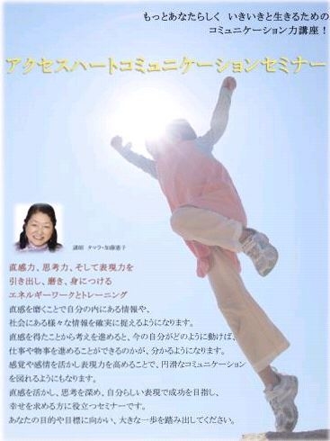 アクセスハートコミュニケーションセミナーin鹿児島 ======================== 講師/タマラ・加藤憲子 主催/アクセスハートプロジェクト 直感を得て、思考し、表現(行動)する。 それが、自分らしい生き方に繋がっていきます。 もっと自分らしく いきいきと生きるために 自分の中にある 直感力・思考力・表現力を 引き出し、磨き、身につけるエネルギーワークとトレーニング。 それがタマラ・加藤憲子による 「アクセスハートコミュニケーションセミナー」です。 会員、一般を問わず、どな
