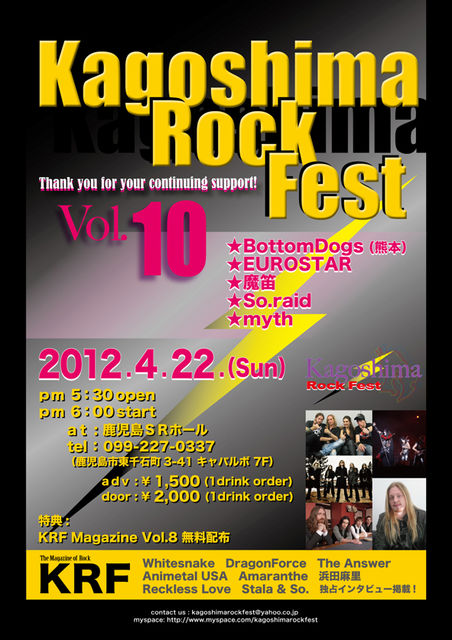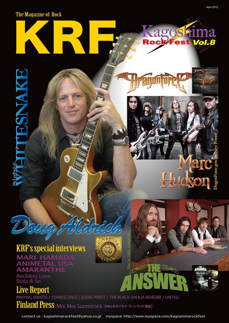 KRFの記念すべき10回目のライブイベントが、4月22日(日)SRホールで開催されます。 今回も個性溢れる出演バンドが勢揃いですので、どうぞお楽しみに。。。 特典として、来場者全員へ無料配布されるKRF Magazine Vol.8には、9バンドへの独占インタビューを掲載予定です。 こちらも豪華版です!! (WHITESNAKE、DragonForce、The Answer、浜田麻里、Animetal USA、Amaranth、Reckless Love、Stala & So.独占インタビュー他掲載予定) お誘い合わせの上、みなさまのお越しを心よりお待ち申し上げます。 なお、出演バンド