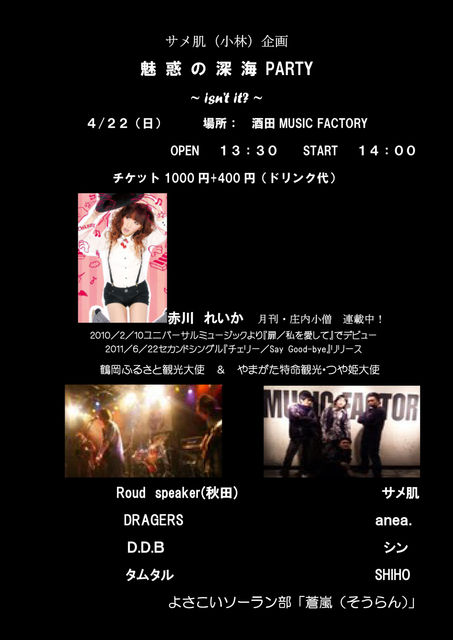 山形県鶴岡市出身、つや姫大使の赤川れいかさん出演決定!! 庄内の実力派アーティストや秋田のバンドも出演します!! サメ肌企画!! 『魅惑の深海PARTY 〜isn't it ? 〜』 ◇ 4月22日(日) 13:30 open 14 :00〜start ◇ 酒田 Music Factory ◇ \1000+400(1D) ◆出演◆ サメ肌 SHIHO 赤川れいか(東京・鶴岡市出身) Dragers D.D.B タムナラ Loud Speaker(秋田) シン Anea よさこいソーラン部(蒼嵐)