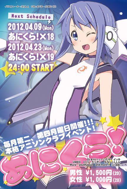 あにくら!×19 @川崎 club 月あかり夢てらす !!!開催日!!! 2012年04月23日 月曜 !!!開催時間!!! 開演 24:00〜 !!!入場料!!! 男性1,500 女性1,000 ※各2ドリンクサービス付 ※再入場可能(コスプレを着たままの外出はご遠慮ください) !!!イベント内容!!! 第二、第四月曜日はあにくら! 憂欝な月曜日をぶっ飛ばせ! 週末にイベントが集中しているこのご時世。 平日だって遊びたい!!! 平日が休日の人もいるんだし! 平日に休みたい人もいるんだし! 休日は混んでるから家から出たくない人もい
