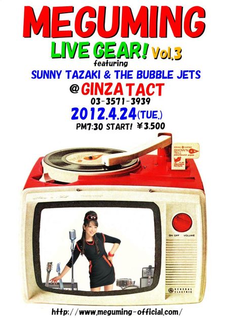 るんるんMEGUMING LIVE GEAR! Vol.3るんるん 皆様、お待たせいたしました〜ムード MEGUMING LIVE GEAR! Vol.3ですexclamation ×2 新橋から銀座へ会場を移し、更にパワーアップしてお届けいたしますので、 お楽しみに〜チューリップ 日時:2012年4月24日(火)   OPEN 18:30  START 19:30 出演:原めぐみ、サニー多咲とバブルジェッツ、サリー石川    料金: ¥2,700+drink(¥800) 場所: 銀座タクト  東京都中央区銀座6-9-15 タクトワンビルB1F TEL:03-3571-3939    http://www.ginzatact.co.j