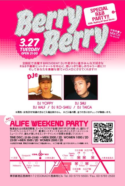 エントランスで ◆◆◆ヨッピーのゲストのヨッピー◆◆◆ と言っていただければ、 誰でも何人でも 特別ディスカウント料金で入場できます ※※※※※※※※※※※※※※※※※※※※ ■男性2000/2Dが→ ゲスト取得で先着100名様にMIX CDプレゼントぴかぴか(新しい) ■女性1000/飲み放題が→ ゲスト取得で先着100名様にMIX CDプレゼントぴかぴか(新しい) ※※※※※※※※※※※※※※※※※※※※ でご案内できまするんるん さくらんぼBerry Berryさくらんぼ@alife alifeがお送りする BIG R&B PARTYexclamation ×2exclamation ×2