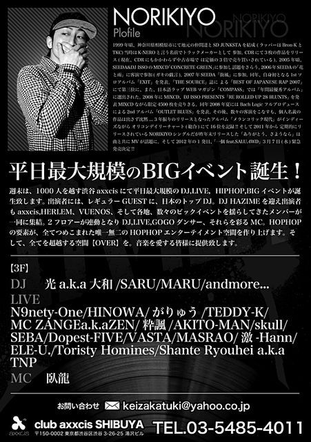 管理人様告知失礼します。 渋谷の若者やHIP-HOPファンから話題沸騰の平日都内最大規模ビックイベントが誕生します!!! 渋谷axxcis【OVER】 記念すべき1発目のスペシャルゲストには この日逃したら、なかなか平日は見れないしかも渋谷でLIVEをやらない!!! 大人気アーティスト!! この日だけのスペシャルライブ!!!! 『NORIKIYO』 そしてフロアを沸かすのは、週末のaxxcisやHARLEMなど様々な人気クラブにレギュラーを持つ日本のトップDJ 『DJ HAZIME』 その他、2F、3F2フロアー連動になり 総勢35組