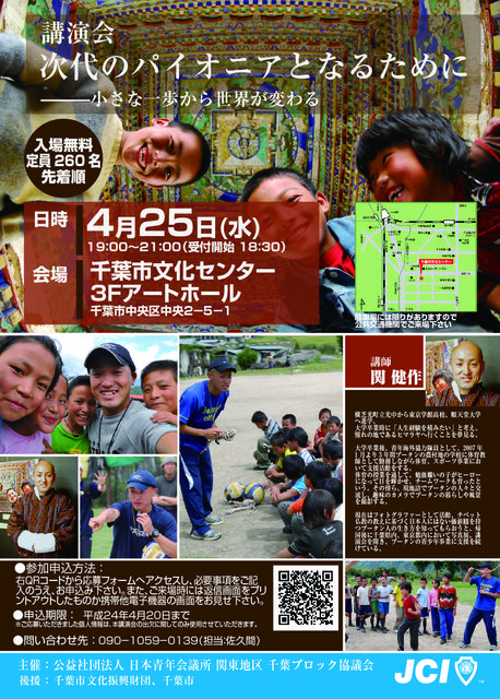 ブータンにて青年海外協力隊として3年間活動した写真家の關さんの講演会です 講演会「次代のパイオニアとなるために、小さな一歩から世界が変わる」 日本とは異なる価値観の国、ブータンにて体育授業の普及活動に貢献した関健作氏を講師に呼び、課題に直面したときにどのように対処したのか、課題を乗り越えるために必要なチームワークの重要性について、また、自分たちの活動の魅力をより多くの人々へ効果的に伝えるための取組みについてご講演をいただきます。 [日時] 2012年4月25日(水)19時〜21時(18時半より受付開始