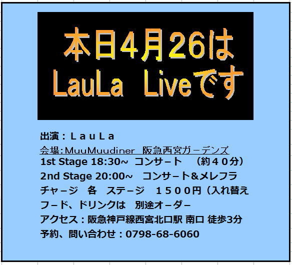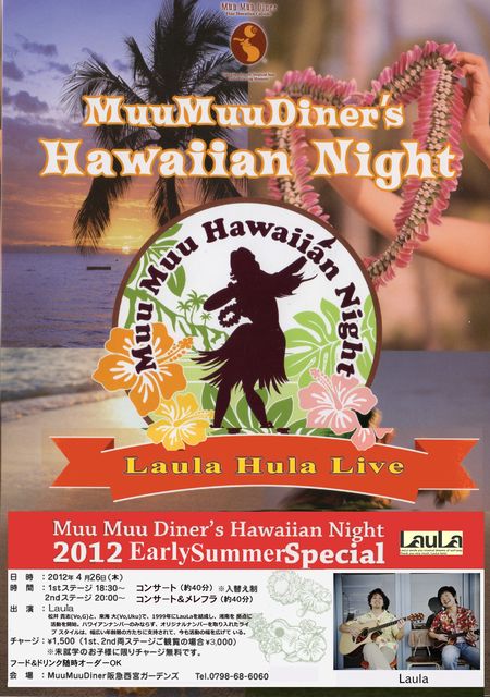 LauLaHulaLive S2012Early Summer Special 日時:4月26日(木) 出演:LauLa 会場:MuuMuudiner 阪急西宮ガ−デンズ 1st Stage 18:30~ コンサ−ト (約40分) 2nd Stage 20:00~ コンサ−ト&メレフラ (約40分) チャ−ジ 各 ステ−ジ 1500円(入れ替え制) フ−ド、ドリンクは 別途オ−ダ− アクセス:阪急神戸線西宮北口駅 南口 徒歩3分 予約、問い合わせ:0798-68-6060 まだ 席が あります。ぜひおいで下さい。 http://hawaiianjamboree.web.fc2.com/blog/gardens/laula12.htm