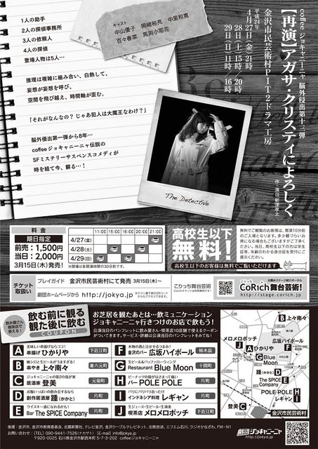 coffeeジョキャニーニャ 脳外侵出第十三弾 【再演】アガサ・クリスティによろしく 【日時】 2012/04/27(金) 21:00〜 2012/04/28(土) 15:00〜/20:00〜 2012/04/29(日) 11:00〜/16:00〜 (会場は開演の30分前です) 【場所】 金沢市民芸術村PIT2ドラマ工房 地図 【料金】 前売 1,500円(期日指定)→メールでのお申し込みは info@jokya.jp まで 当日 2,000円 高校生以下無料 (無料のお客様は多少観づらいお席となる場合があります) 携帯からの予約はこちらをクリック! CoRich舞台芸術! FX比較 FXブログ 通販ショップ 【あ