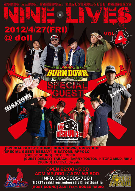 --------RODEO RADIO & FREEDOM& TERUTERU BOUZU PRESENTS-------- 約半年ぶりにNINE LIVES開催!!! 今回は場所を松坂DollにてPARTY TIME!!! 大阪からBIG SOUND BURN DOWNが参戦決定! 飛び鳥を落とす勢いのRISKY DICEが登場!!! DEEJAYには人気急上昇 『STAY WITH ME』がレゲエザイオンでランキング1位を獲得したHISATOMI 大阪で若手の中でも圧倒的な実力で様々な現場を湧かし、フェスなどでも活躍する実力派APOLLO GW直前、是非爆音レゲエを堪能ください♪ 〜NINE LIVES Vol.4〜 2012 4/27(fri) @doll(松坂