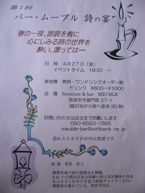 初イベントのご案内です。 関西各地で詩の朗読会を開催されている菅原哲夫さんのご提案で、ほろ酔いの中、宮沢賢治の作品を菅原氏のふるさと岩手の方言にての朗読…などを予定しています。 通常より30分早いスタートで、普段通りの営業形態でお待ちしてます。