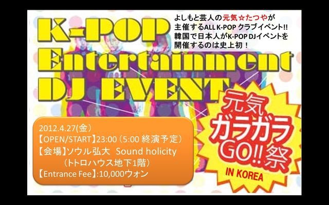 元気ガラガラGO祭り!in Korea よしもと芸人の元気☆たつやが「ALL K-POP クラブイベント!」をホンデのクラブを貸しきって開催しちゃいます 韓国で日本人がK-POP DJイベントを開催するのは史上初 留学生も韓国人もたくさん来ちゃいます この日、旅行で韓国を訪れている方も是非お気軽にご参加ください 【日時】2012.4.27(金) 23時〜翌朝5時 【会場】ソウル弘大の「Sound holicity」というクラブです (トトロハウスの建物の地下1階) ホームページ:http:/