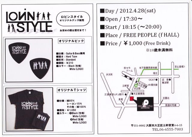 前回の[LIVE8]からおよそ4ヶ月 LOVIN STYLE では珍しく、 たった4ヶ月という短い期間で [LIVE9]が本日決定致しました これまで、 年間2本のLIVEが精一杯だったロビスタですが 本年は3本行けるやもしれません ■□■ LIVE詳細 ■□■ [DAY] 2012.04.28(sat) [PLACE] STUDIO [FREE PEOPLE] [OPEN] 17:30〜 [START] 18:15 (終演予定20時頃) [PRICE] \1,000 (Free Drink) ※当日の集客状況により開演時刻が 若干前後する場合が御座いますが、 終演予定時刻には影響しませんので