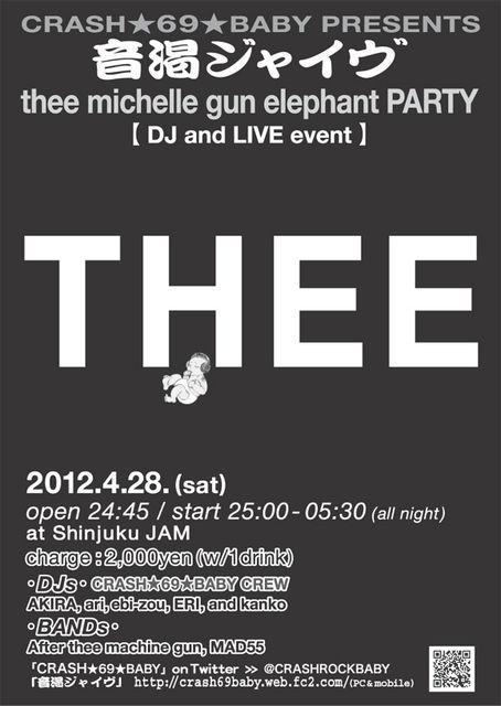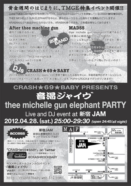 『音渇ジャイヴ thee michelle gun elephant party』 thee michelle gun elephant Live&DJイベントを開催します。 黄金週間を、rockではじめませんか? ARABAKIへ行けない方も、ARABAKIを堪能された方も(笑)是非! 日時:2012年4月28日 (sat) 24:45(open) / 25:00〜29:30 ※深夜スタートのオールナイトイベントです 。 会場:「新宿JAM」 http://jam.rinky.info/ 東京都新宿区歌舞伎町2-3-23 セントラルビル1F&B1 TEL 03-3232-8168 (15:00〜24:00) 料金:2,000円(1drink込) 出演:【LIVE】