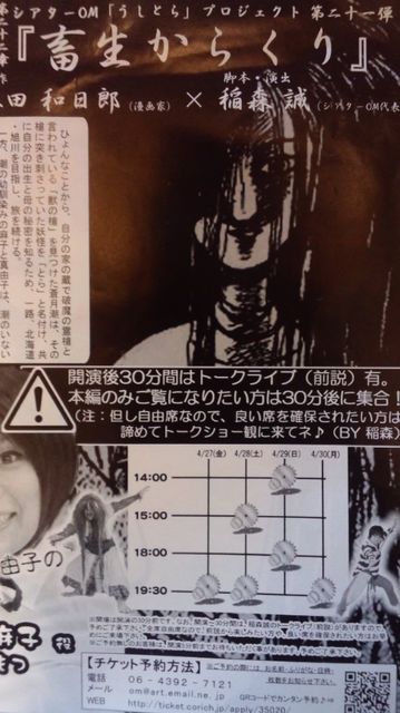 第一部=4/28(土)15:00より、シアターOM「うしとら」プロジェクト第二十一弾第二十二章「畜生からくり」観劇。 第二部=「舞台うしとら」と藤田先生作品を深〜く熱〜く語り合う会。 なお第二部では、いつもどおり藤田先生への寄せ書きをします。 ★費用★ 第一部は前売り料金1500円。 先行チケットもしくは次の予約フォルムにて予約かたお願いします。(読み取れるかわからないですが写メしたQRコードもアップしております) http://ticket.corich.jp/apply/35020/ 第二部=目指せ2500円以内(笑) ★参加対象★ 藤田先生ファンは皆友だちコミュ参加