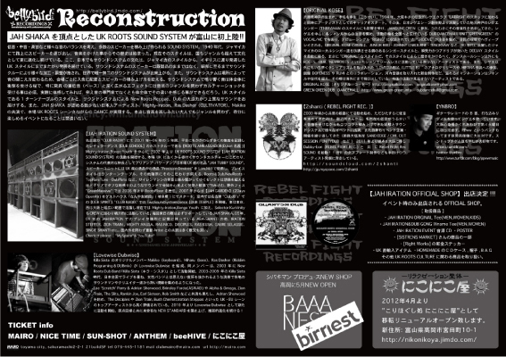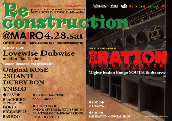 今週末の@STEREOに引き続き、来月は富山@MAIRO! 楽しみが多いという事は良い事ですね!お近くの方は是非!是非! 物販、FOODの出店もあります。存分に満喫しましょう! 2012−4−28(sat) ◆Reconstruction◆ TOYAMA UNDERGROUND REGGAE PARTY @MAIRO http://mairo.com/mairo/ 富山県富山市桜町 2-2-29 21ビル 5F(1FパチンコBIG TIGERさんが目印) Open 22:00 ADV 2,500yen(1D) DOOR 3,000yen(1D) ◆Guest Live◆ LovewiseDubwise -makiko,RasDasher-