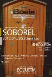 管理人様、告知失礼します。 ~electronic music broadcast station~ 【SOBOREL】 2012.4月28日(土曜日) 開催場所/魚津市@BOQUERIA START/20:30〜 DOOR:2000YEN W/F:1500YEN 【DJ】 HIEKICK RYUJI MITSURU DAISUKE TAKESHI YAMAGUCHI TAIKI KANAMI 894 SOBOREL(富山弁で【驚く、びっくりする】の意味は、魚津市・新川地区のDJが中心となり、地元活性化も含めBOQUERIAで気軽に誰でも立ち寄れる場所、ELECTRONIC MUSIC BROADCASTをコンセプトに開催される心地良く楽しい時間と空間、パワフルな情熱と刺激、多