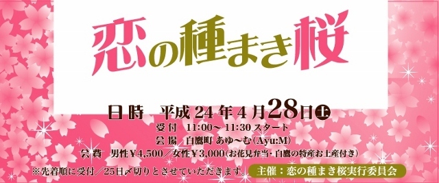 恋の種まき桜実行委員会よりお知らせ★ 桜を通して、町の活性と人との交流を図る活動をしています! 4月28日にイベントあります! 詳細はhttp://koinotanemakisakura.web.fc2.com/index.html見てね^^ あたしにメールでもOKです♪