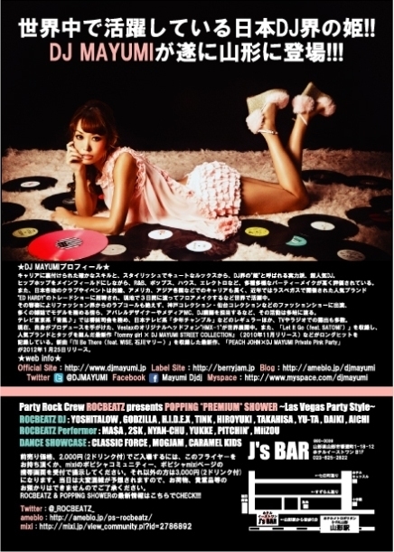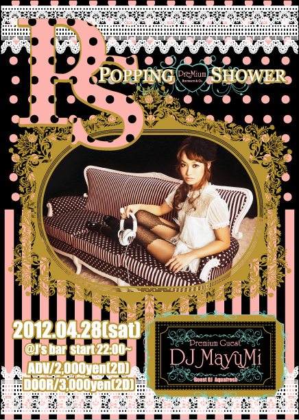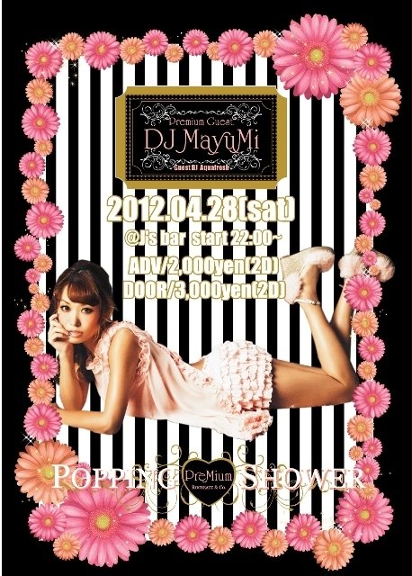 POPPINGPREMIUMSHOWER PEACH JOHN×DJ MAYUMI Private Pink Partリリースパーティー 4月28日土曜日 @J'sBAR (ホテルイーストワンBF) OPEN 22:00〜 キャッシャーにポピシャコミュニティーフライヤー提示で ALL 2000円2D ※提示して頂けない場合は3000円(2ドリンク込み)になります。 男性は赤、女性はピンク着用でチュッパチャップスプレゼント PEACH JOHNとコラボMIX CDで話題のDJ界の姫、DJ MAYUMIが