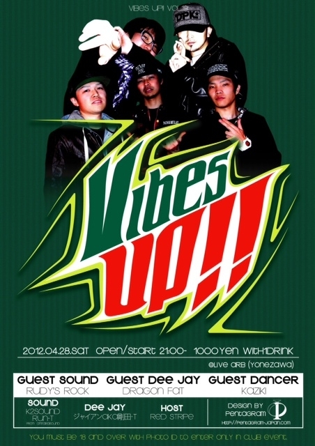 〜VIBES UP! Vol.19〜 2012.04.28.SAT @Live ARB (米沢) Open/Start 21:00〜 1000yen with1drink 【GUEST SOUND】 RUDY'S ROCK from 88STUDIO 【GUEST DEE JAY】 DRAGON FAT from 88STUDIO 【GUEST DANCER】 KAZIKI 【SOUND】 K2SOUND RUNーT from AMITABASOUND 【DEE JAY】 ジャイアンaka剛田-T 【HOST】 RED STRIPE VIBES UP!VO.19は庄内からSOUND、DEEJAY、DANCERをGUESTにSpecial dance!! 音好き、レゲエ好き、とにかく踊りたい!そんな人は4月28日土曜日はLIVE ARBに集合!VIBES UP!で遊ぼ