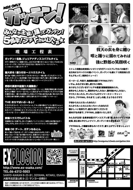 コミュのみなさん、こんにちは! ガッテン!〜12発目〜 プチFINAL!無期限休業!!のご案内です。 大阪で、久々の野郎系ナイト開催です! ご来場、お待ちしております!! ☆先着30名様 Fox-shingo CD プレゼント!! ガッテン!〜12発目〜 プチFINAL!無期限休業!! 日時 4月29日(日・祝前)21:00〜 場所 大阪堂山 EXPLOSION 大阪市北区堂山町8-23 サンヨー会館B1 TEL : 06-6312-5003 http://www.ex-osaka.com/ MEN ONLY 3,000円/1D 2,500円/1D WITH フライヤー 2,000円/1D