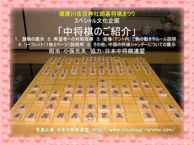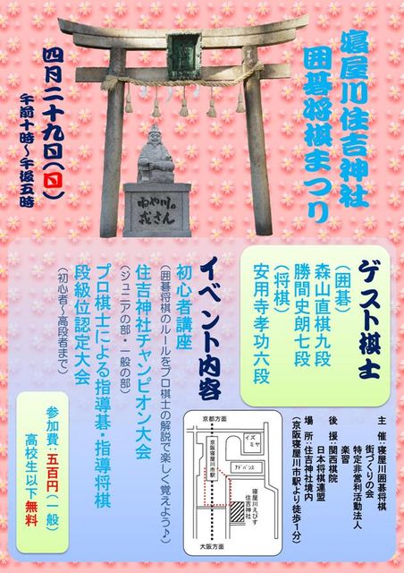 <2012年4月29日開催: 寝屋川住吉神社囲碁将棋まつり > 全国的に著名な囲碁将棋の街寝屋川で寝屋川住吉神社囲碁将棋まつりが開催されます。 youtube映像は、寝屋川囲碁将棋まつり(2011年)より 2012年4月29日、全国的に著名な囲碁将棋の街寝屋川主催の囲碁将棋イベントが開催予定。 下記: イベント日時:2012年4月29日(午前10時〜午後5時まで) (イベント内容) 初心者講座、住吉神社チャンピオン大会、プロ棋士による指導碁、指導将棋、段級位認定大会 ゲスト:森山直棋九段(囲碁)、勝間史郎七段(囲碁)、安用寺孝功六段(