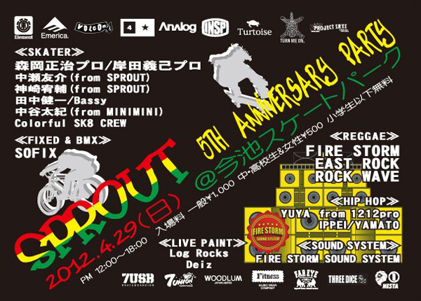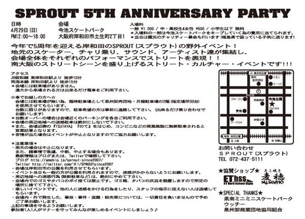 4.29(日)岸和田今池公園ストリートカルチャーイベントSPROUT 5周年 ANNIVERSARY PARTY SPROUT 5周年です! やります!! 念願の野外イベントを!!! 地元のスケーター、 チャリ乗り、 サウンド、 アーティスト達が 集結し、 それぞれの パフォーマンスで 南大阪の ストリートシーンを 盛り上げる ストリート カルチャー イベントです!!! SP
