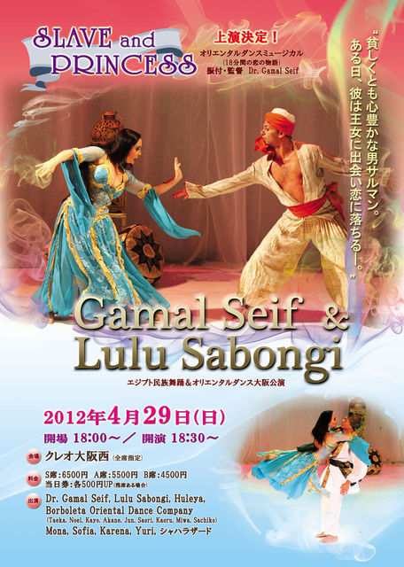 “貧しくとも心豊かな男サルマン。 ある日、彼は王女に出会い恋に落ちる―。” ドイツとブラジルで大好評を博した、Dr.Gamal seif 振付・監督によるオリエンタルダンスミュージカル”SLAVE and PRINCESS” (18分間の恋の物語)の日本初上演決定!! <今年ぜったいに見逃せない演目のひとつだと確信してます◎> それに加え、Gamalによる13分間の本格的なスーフィー(旋回舞踊)やサイディ、東京で注目度ナンバー1のHuleya率いる"Borboleta Oriental Dance Company"によるマンブーティ(漁師の踊り)など、関西ではなかなか観ることのできな