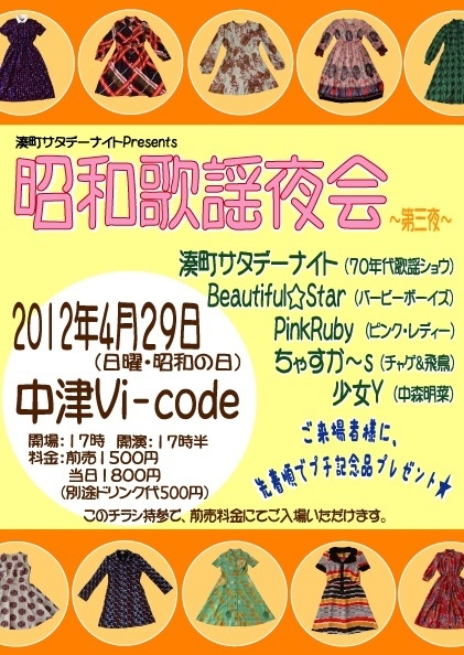 毎年恒例、昭和の日・昭和歌謡バンドイベント、 「昭和歌謡夜会」がやって参りました☆ 最高で最強の昭和歌謡バンドを集めてお送りさせて頂きます♪ 今年も最高の一夜になること間違いなし☆ 昭和歌謡ファン必見のライブイベントです!!! ♪湊町サタデーナイトPresents 昭和歌謡夜会〜第三夜〜 4月29日日曜(昭和の日) 中津Vi−code http://www.vi-code.com/ 〒531-0071 大阪市北区中津3-1-19 Tel.06-6371-6559 Fax.06-6371-6549 開場:17時 開演:17時半 料金:前売1500円、当日