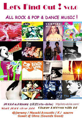 最新のIndie-Rock、Electro-Rockを中心に、ジャンルレスにcoolでcuteな音が溢れるパーティー。2000年始動、2009年第2期がスタートし、音溶では初めての開催となる「Let’s Find Out !」今回は「Sounds Good」のOhno氏を招き、よりカラフルな音空間を目指します。