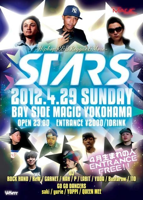 CLUB BAYSIDE YOKOHAMAで2008年11月に初パーティを開き、250人以上ものお客様にご来場頂いた【STARS】 今までのSTARSでは、ヒューマンビートボックスのAFRA、海外アーティストDJ DRAMAを迎え、東京、横浜、六本木、横須賀などで活躍するDJ陣が構え幅広い選曲にて、他のイベントとは一味違った空間を演出しています!! 『BAYSIDE MAGICエントランスにて【DJりゅうのゲスト】と一言伝えて頂ければディスカウント料金にて、何人でも、どなたでも、 入場可能になります。 ぜひお気軽にお使いください! 』 そんなイベントが 4月29日