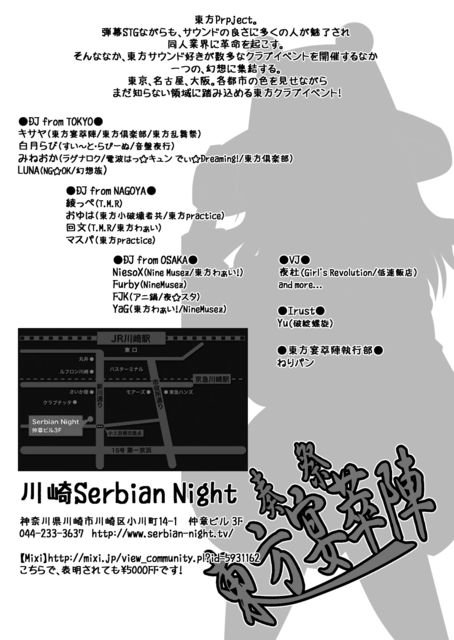 東名阪の東方クラブイベントで活躍されてるDJがここ関東に集結! 初開催で、出演者、執行部ともに気合十分です!!! 次の日は祝日というのもありますので 気軽に東方サウンドを大音量でお楽しみくださいね(●ω●) 奏祭「東方宴萃陣」 第一陣 ■日時 4月29日(日) 14:00〜20:00 ■場所 川崎セルビアンナイト http://www.serbian-night.tv/ ■入場料金 一般参加者 3000円+1ドリンク500円 フライヤー持参、参加表明 2500円+1ドリンク500円 こちらのTweetViteでの参加表明でも割引になります。