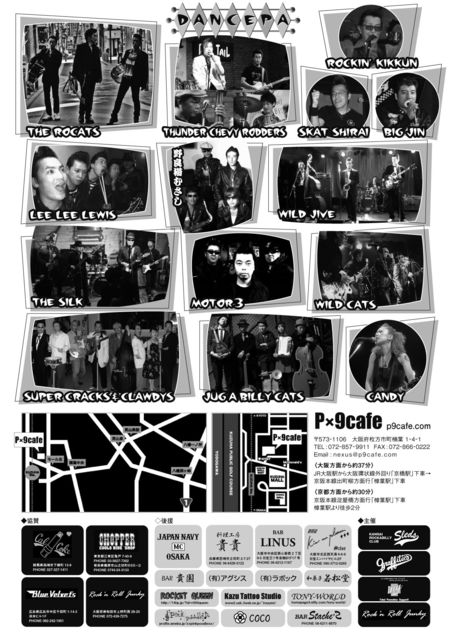 ◆DANCEPA vol.2◆ ◇2012.4.29(SUN) 15:00open 15:30start    adv \3,000+drink\500 / door\3,500+drink500 ◇BAND    THE ROCATS    THE SILK    MOTOR3    WILD CATS(from WAKAYAMA)    THUNDER CHEVY RODDERS(from OKAYAMA)    LEE LEE LEWIS(from KYOTO)    野良猫むさし    JUG A BILLY CATS & CANDY    WILD JIVE    SUPER CRACKS & CLAWDYS    DJ:SKAT SHIRAI    DJ:BIG JIN    MC:ROCKIN' KIKKUN ◇樟葉 Px9cafe  http://p9cafe.com/    大阪府枚方市町楠