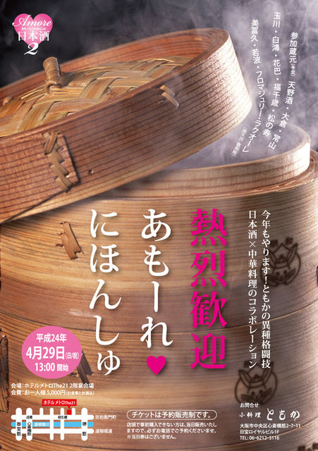 今年もやります!ともかの異種格闘技 日本酒×中華料理のコラボレーション 熱烈歓迎 あもーれ・にほんしゅ 日時:4月29日(日・祝)13時〜16時(12時半開場) 会場:ホテルメトロTHE21 2階宴会場    (堺筋から宗右衛門町を西に入ってすぐです。日本橋から5分) 会費:5000円(立食のお食事と日本酒込) !注意点!  前売チケット制。あらかじめ店頭にて、ご購入ください。  事前にご来店いただけない場合は、電話にてご予約の上、  当日払いOKです。  当日券はございませんので、必ずご予約くださいませ。 参加し