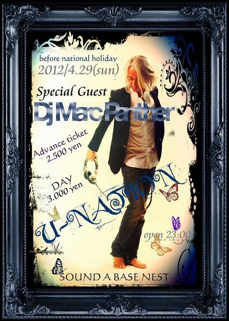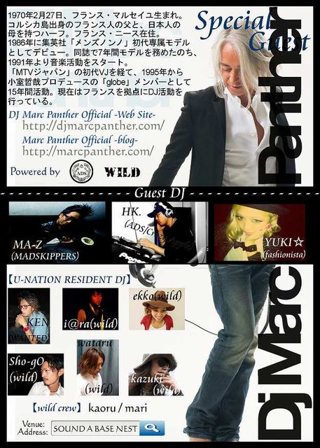 管理人様告知失礼いたします! ‐‐‐‐‐‐‐‐‐‐‐‐‐‐‐ 国民的大ヒット曲を 数々と作り上げ、 日本の音楽シーンに その名を刻み、 確固たる地位を築いた 『伝説のスーパー・ユニット』 多くのリスナーの心を惹き付ける 彼らの魅力の説明は 今さら必要ないだろう… 小室哲哉プロデュース あの《 globe 》より 【MARC PANTHER】 - U-NATION - 降臨!! ★before national holiday★ 4月29日(日・祝前) START 23:00 Venue : SOUND A BASE NEST 《SPECIAL GUEST》