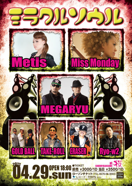 GOLD BALL出演!!!{4/29sun}■MEGARYU■Metis ■Miss Monday トリプルМ!!! 3組のLIVEがたっぷり楽しめる「ミラクルソウル」 TEEのリリパでも大好評だった「ミラクルソウル」がとんでもない面子でVOL.2開催決定!!! 今回は3つの「М」がキーワード!!! 3つの「М」が感動を与えてくれる!!! 4/29は「桜(CherryBlossom)」に集合♪ ))))) MEGARYU ((((( ))))) Metis ((((( ))))) Miss Monday ((((( ■ミラクルソウル ■2012/4/29(日) ■OPEN/18:00 CLOSE/21:00 ■場所:桜〒320-0034 栃