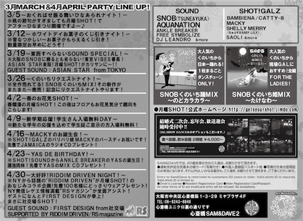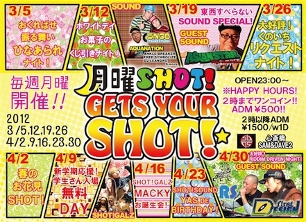 告知失礼します。 ※パーティの春です! ”月曜SHOT!”〜GETS YOUR SHOT!〜 毎週〜毎週〜大阪月曜〜狂い咲き! 男子も女子もみんな2時まで\500ポッキリ! みんながお得!ワンコイン入場のHAPPY HOURS! 知ってるひとはお早めからお楽しみです! さらにサプライズで大好評の ドリンクのディスカウントも飛び出し中! BARカウンターが常大忙しです! GALはかわいくMENSの振る舞い酒〜 毎週替わりの企画もご用意してます! 3〜4月も乞うご期待! SOUNDはJAMAICAでも活動するレゲエエンターテイナーSNOBと 神戸を中心に