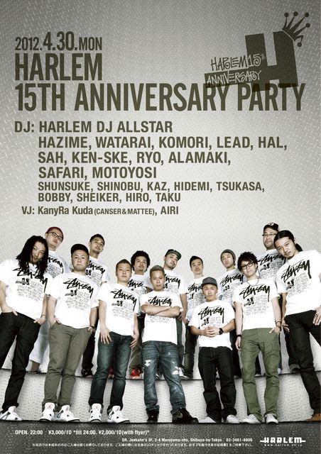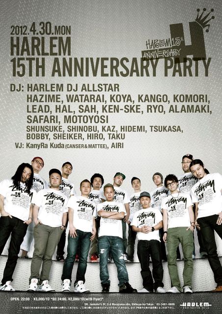管理人様、告知失礼します!! 4/30 "HARLEM 15TH ANNIVERSARY PARTY" 今夜は見逃してはいけないスペシャルパーティー!! 時代の先を行くDJ[HAZIME, WATARAI, KOMORI, LEAD, HAL, SAH, KEN-SKE, RYO, ALAMAKI, SAFARI, MOTOYOSI]が一堂に介する、他には決して真似することの出来ない一年に一度の祭典が、いよいよ幕を開けます。 ■22:00 OPEN _________________________________________________ DJs HAZIME, WATARAI, KOMORI, LEAD, HAL, SAH, KEN-SKE, RYO, ALAMAKI, SAFARI, MOTOYOSI SHUNSUKE SHINOBU KAZ HIDEMI TSUKASA B