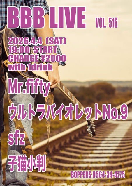 BBB LIVE 516 2026.4.4 (SAT) 19:00 START CHARGE \2000 with 1drink Mr.fifty ¥¦¥ë¥È¥é¥Ð¥¤¥ª¥ì¥Ã¥ÈNO.9 sfz »ÒÇ­¾®È½
