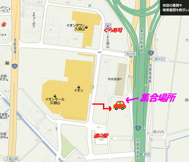 日程:5月26日(土) 場所:イオンタウン(旧ジャスコ)久御山東側駐車場(重要?必読) 時間:21時〜 ☆重要☆ いつものイオンタウン内の駐車場は毎週末になるとおまわりさんが精を出して頑張っておられます。ですので、比較的静かな駐車場に変更しましたので、間違えないように気を付けて下さい。 いつも最後に集まる道の駅の北側にある駐車場です。 ☆注意☆ 一般の方も利用されてますので、細心の注意を払って集まりましょう! イジり後のゴミは持ち帰りで! おまわりさんが来たら黒さんに対応してもらいまし