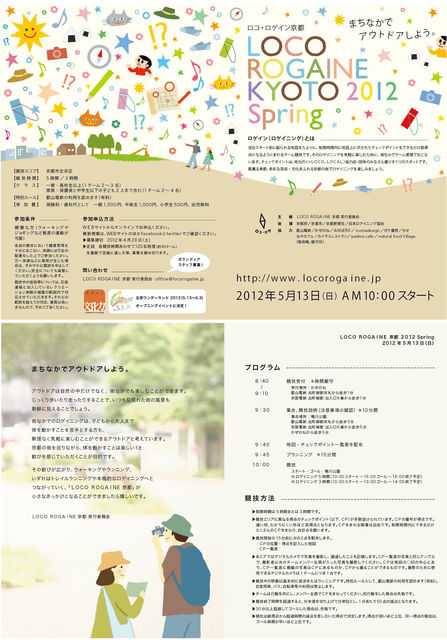 *ちゃり外活動【雑談トピ】*で興味ありの人が結構いるようなのでイベントトピにしました。 当日スタート前に配られる地図をたよりに、制限時間内に地図上に示されたチェックポイントをできるだけ高得点になるようにまわる、チームで参加のイベントです。 開催地が京都で、隠れた名所やおいしい店がチェックポイントになっているようです。 イベントの詳細は「LOCO ROGAINE 京都 2012 Spring ―まちなかでアウトドアしよう。―」(http://www.locorogaine.jp/)で確認してください。 定員に達したとのことで、申し込みは締め切られてしまい