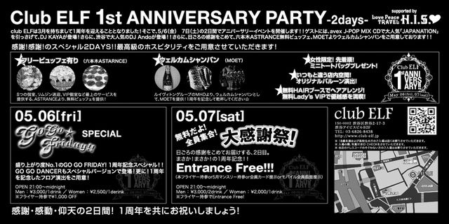 clubELF¤Ï¤Ä¤¤¤Ë°ì¼þǯ¤ò·Þ¤¨¤ë¤³¤È¤È¤Ê¤ê¤Þ¤·¤¿ ¤½¤³¤Ç5/6(¶â)¡¢7(ÅÚ)¤Î2Æü´Ö¤Ç¥¢¥Ë¥Ð¡¼¥µ¥ê¡¼¥¤¥Ù¥ó¥È¤ò³«ºÅ¤·¤Þ¤¹ ¥²¥¹¥È¤Ë¤Ïavex J-POP MIX CD¤ÇÂç¿Íµ¤¡ÖJAPANATION¡×¤ò°ú¤Ã¤µ¤²¤Æ DJ KAYA¤¬Åо줵¤é¤Ë½Âë¤ÇÂç¿Íµ¤¤ÎDJ Ando¤¬Åо줵¤é¤ËÆüº¢¤Î´¶¼Õ¤ò¤³¤á¤Æ ¡ùÏ»ËÜÌÚASTRANCE¤è¤ê¥Õ¥ê¡¼¥Ó¥å¥Ã¥Õ ¡ùMOET¤Î¥¦¥§¥ë¥«¥à¥·¥ã¥ó¥Ñ¥ó ¡ù½÷À¸ÂÄꡪÀèÃå¤Ç¥ß¥Ë¥È¡¼¥È¥Ð¥Ã¥°¥×¥ì¥¼¥ó¥È ¡ù¤¤¤Ä¤â¤È°ã¤¦Å¹Æâ¶õ´Ö¤Ë̵ÎÁ¥Ø¥¢¥Ö¡¼¥¹¤âÀßÃÖ 05/06[fri] ¢£GoGoFriday SPECIAL¢£ À¹¤ê¾å¤¬¤êÅÙ