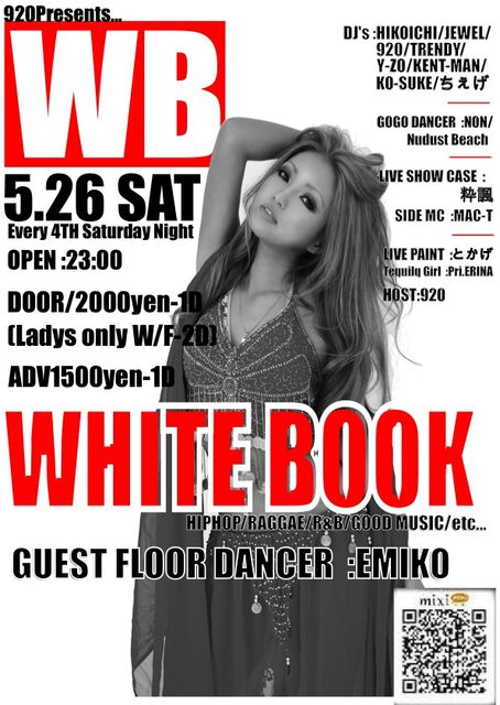 〜920 PRESENTS.〜 【WHITE BOOK 7th. 】 @ 越谷CACHE CACHE DATE: 2012.5.26.SAT TIME: OPEN 23:00 CLOSE 5:00 PRICE: DOOR/2000yen-1D ADV 1500-1D(Ladys only W/F‐2D) GENRE: Hip Hop/R&B/Reggae/Good Music/etc... 【GUEST FLOOR DANCER】 EMIKO 【DJs】 HIKOICHI JEWEL KENT-MAN TRENDY Y-zo KO-SUKE ちぇげ (from CACHE CACHE) 【GOGO DANCER】 NON Nudist Beach 【SIDE MC】 MAC-T 【LIVE PAINT】 とかげ 【Tequila Girl】 Pri.ERINA 【HOST】 920 開催場所は埼玉トップ