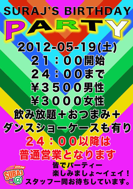 今月5月で当BAR−Ing(イング)は、ナ・ナ・ナント15周年を迎えるそうです 1997年5月より生まれ今年5月でマル15年の年月を営んできたワケです。 毎年、記念パーティーは行っていますが、今回は節目の年 いっちょ派手に騒いじゃいましょう って事で、今後進化を魅せる当店に期待して頂きたく改めて、、、 ‘周年’記念パーティーを開催いたします 今年も『仮装』してご参加下さい standard drink:ALL¥700− Entrance : F