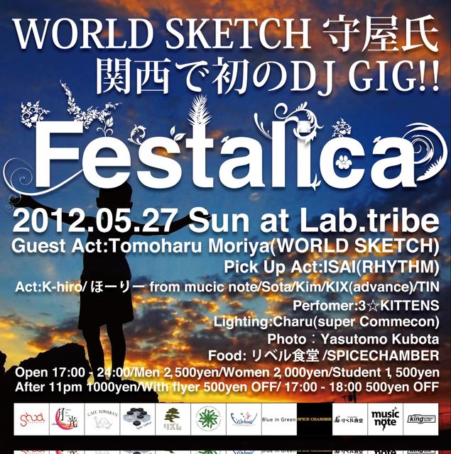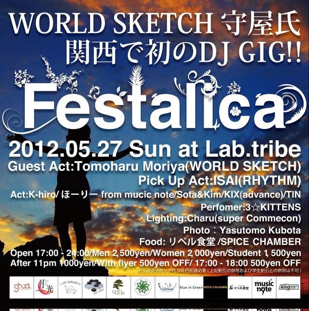 Festalica 〜祝!WORLD SKETCH守屋氏関西初DJ gig〜 【 DATE 】 : 2012年5月27日 (日曜日) 【 TIME 】 : 17:00~24:00 【 PLACE 】 : Lab.tribe 【 ADDRESS 】 : 京都府京都市中京区一之船入町366 【 WEB 】:http://www.labtribe.net/ 【 Charge 】:Men 2,500yen/WOMEN 2,000yen/Student 1,500yen/After 11pm 1000yen with flyer 500yen OFF/18時までにご来場の方は500円OFF *ドリンクチケット代500円別途必要 【Act】 Guest Act:Tomoharumoriya(WORLD SKETCH) Pick Up Act:ISAI(RHYTHM)