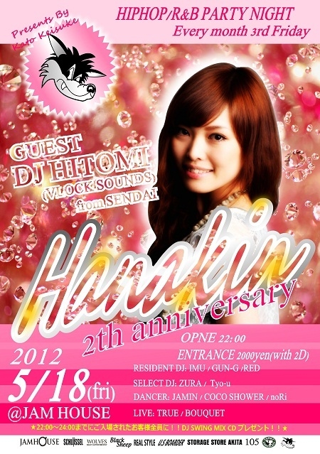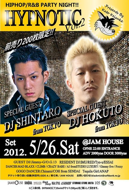 2012.3/24(Sat)、Special GuestにDJ SWINGを招き、秋田市のHIPHOP PARTYにて、革命的な盛り上がりを魅せたHYPNOTIC vol.1!早々と、vol.2が迫ってきてます!今回は、全国のCLUBシーンでも話題沸騰!国内から海外ツアー、海外アーティストとのコラボ!そのフットワークの広さは、DJとしてのセンス、スキルはもう言うまでもない!DJ HOKUTO × DJ SHINTARO来秋!