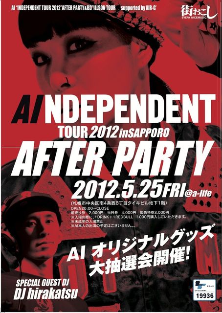 管理人様告知失礼します。 INDEPENDENT 5月:皐月 春風と共に、北海道内1,500Km駆け抜けたGWツアーを、沢山の音楽や、遊び好きな方々と 過ごすことができたことを感謝しています。ありがとうございます。 5月度は、街おこし開催当日が、札幌市ホールで行われますAI “INDEPENDENT TOUR 2012”ということで、そのAFTER PARTYを いつもAIのLIVEバックDJを務める DJ HIRAKATSU(ヒラカツ)を迎え盛大に行い。また、もう一組、東京ハードコア・ヒップホップの正統な後継者B.D.をゲストに迎え、 夏へ向けて、その“ 遊び心 ”と