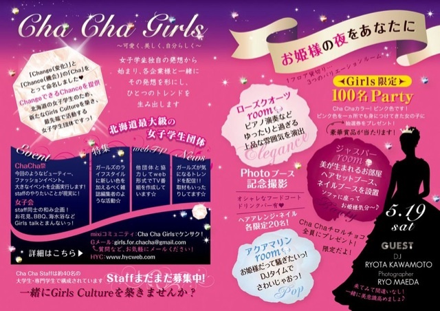 ChaChaGirls プレゼンツ!! ビューティ&ファッション 交流会イベント★ 【女子100名限定】 ジャスマックホテルの系列 J-room 3番館 6F(3部屋)貸切り!! →2500円 限定100名なのでチケット制です" すぐなくなるのでお早めに♪ 思いっきり騒ぎたい子も どっちかというと静かなほうが…という子も みんなwelcome!!!!! そのために3つのバリエーションルームを もうけました★ ・elegance ・beauty ・pop 色んなお部屋をいったりきたり… 自由で素敵な時間を提供します! 企画内容★ ◎ChaChaカラーコー