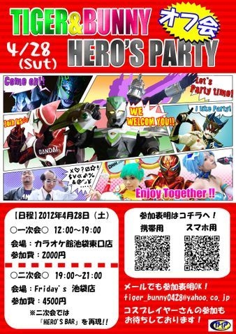 オフ会に参加された皆様、お疲れ様でしたexclamation ×2 一次会ではヒーローたちに盛り上げて頂き、二次会ではHERO'S BARを演出することもできましたウインクご協力頂いて本当にありがとうございましたexclamation ×2 さらに二次会ではFRiDAY'Sを貸し切り、HERO'S BARを再現ぴかぴか(新しい) タイバニ好きなら誰でも参加OK手(チョキ) 昼間からガッツリとT&Bで楽しみましょうぴかぴか(新しい) オフ会初心者さん、タイバニレイヤーさん大歓迎晴れ 共通の話題があると友達も作りやすいので、この機会にどんどん友達を作っちゃってくださいるんるん 長時間のオフ会なので、タイ
