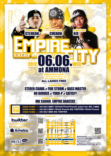 【緊急告知】6/6(水)EMPIRE CITY LIVEスペシャル!!! ぴかぴか(新しい)ぴかぴか(新しい)GUEST ぴかぴか(新しい)ぴかぴか(新しい) CHEHON STEREON 寿君 るんるんるんるん最高のLIVEが見れますのでこの日は是非は予定空けとといてくださいるんるんるんるん ■□■□■□■□■□■□■□■□■□■□■□■□ 電球必ずID(身分証明書)をお持ちください電球 毎週水曜大人気“アンモナ”大人気REGGAE・Hh・RB300人PARTYハート達(複数ハート) ムードエンパイアシティムード 早い時間の21時から盛り上がる水モナハート達(複数ハート) それは何故かと言うと… 21時−24時までの「モナ割」で女性は… ドリンクチケットも