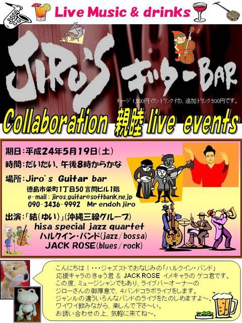管理人さま、告知失礼いたします。 徳島 jiro's guitar bar 4バンドライヴ 詳しくは、添付ファイルのポスターをご覧下さい。
