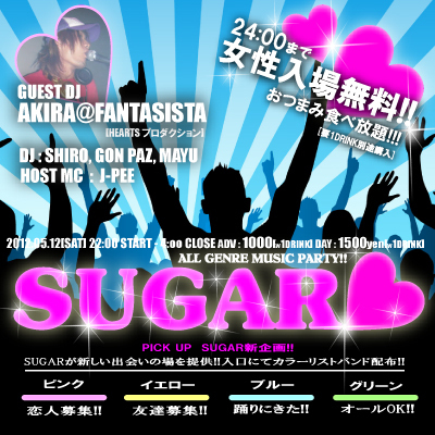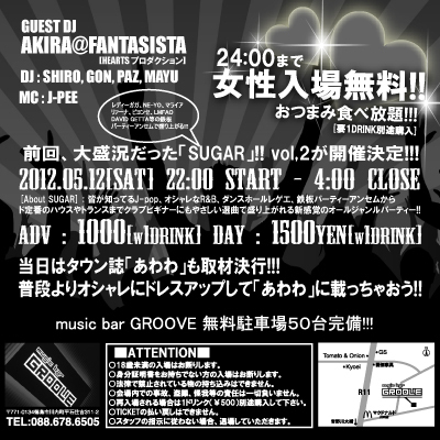 管理人様失礼します。 誰もが楽しめるオールジャンルパーティー SUGAR 入場料 前売り ¥1000【1ドリンク付き】 当日¥1500【1ドリンク付き】 24時までに入場していただいた女性は入場料無料です!!【要1ドリンク購入】 前回GROOVE史上最高入場数を更新、入場制限までかかり大盛況だった『SUGAR』!!vol.2が開催決定!! おつまみ食べ放題!!(笑) 今回もタウン誌『あわわ』が取材にきますので是非オシャレして