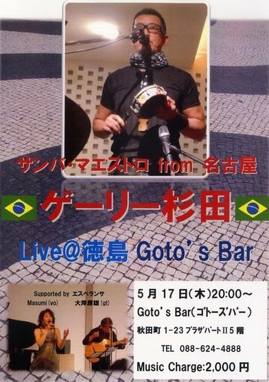 サンバ・マエストロ from 名古屋 ゲーリー杉田 LIVE@徳島 Goto's Bar 2012年5月17日(木) 20:00開演 Goto's Bar にて 徳島市秋田町1-23 プラザパート?5F ミュージック・チャージ 2,000円 (1ドリンク付) 出演 ゲーリー杉田 エスペランサ 名古屋から、サンバ界の重鎮がやって来ます! ブラジルの打楽器を持って、みんな集合! 手拍子やダンスステップも、立派な打楽器です。 お問い合わせ Goto's Bar 088-624-4888